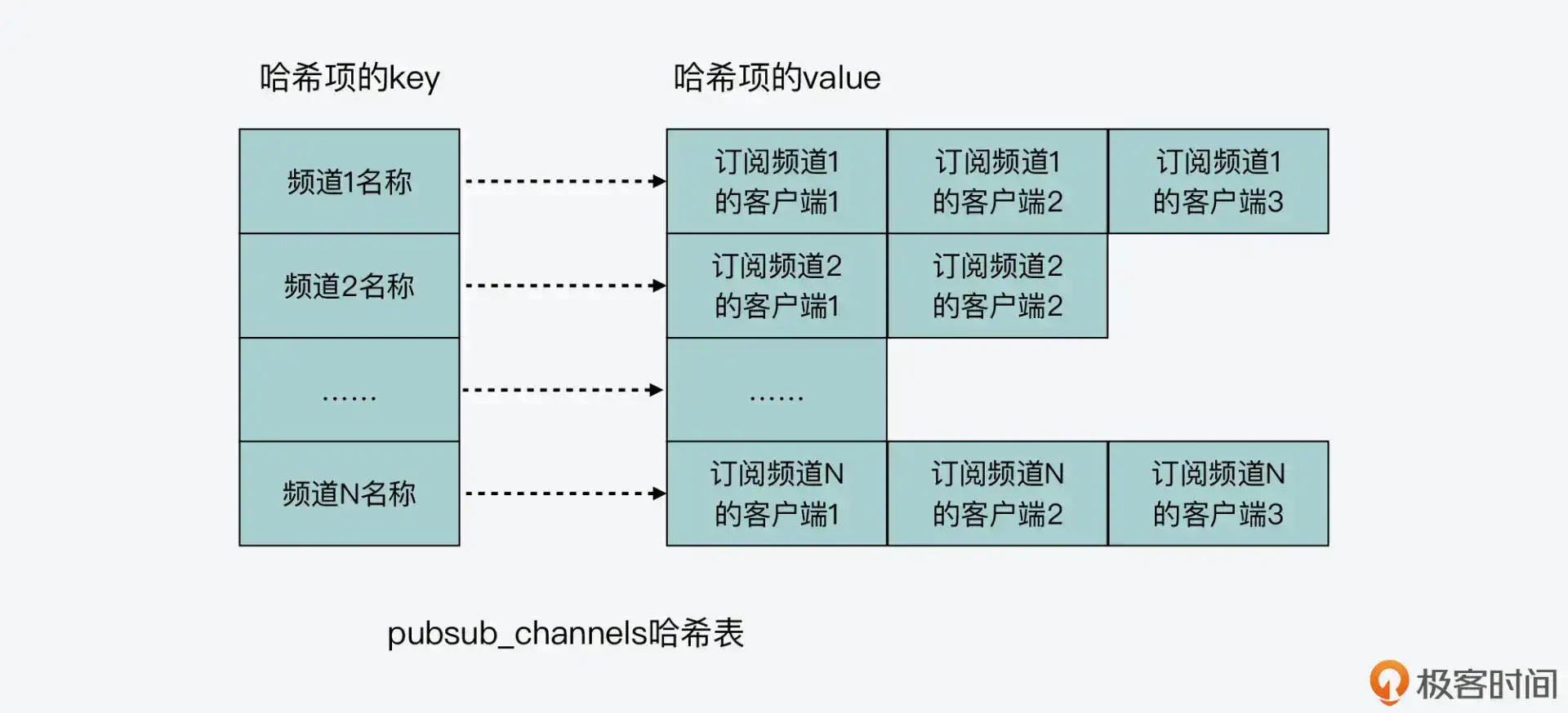 注意,当哈希表是 keylistDictType 类型时,它保存的哈希项的 value 就是一个列表。而之所以采用这种类型来保存频道信息,是因为 Redis 把频道的名称作为哈希项的 key,而把订阅频道的订阅者作为哈希项的 value。就像刚才我们介绍的,一个频道可以有多个订阅者,所以 Redis 在实现时,就会用列表把订阅同一个频道的订阅者保存起来。