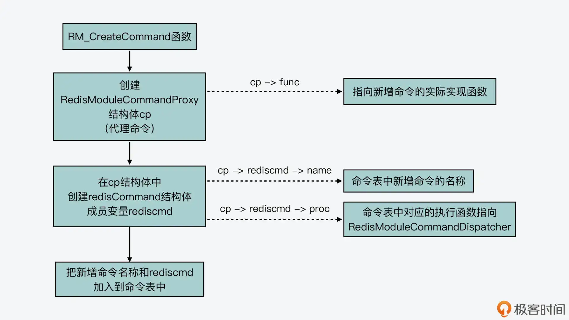 而 RM_CreateCommand 函数的主要作用,是创建一个 RedisModuleCommandProxy 结构体类型的变量 cp。这个变量类似于新增命令的代理命令,它本身记录了新增命令对应的实现函数,与此同时,它又创建了一个 redisCommand 结构体类型的成员变量 rediscmd。