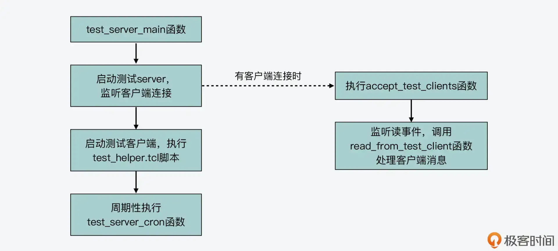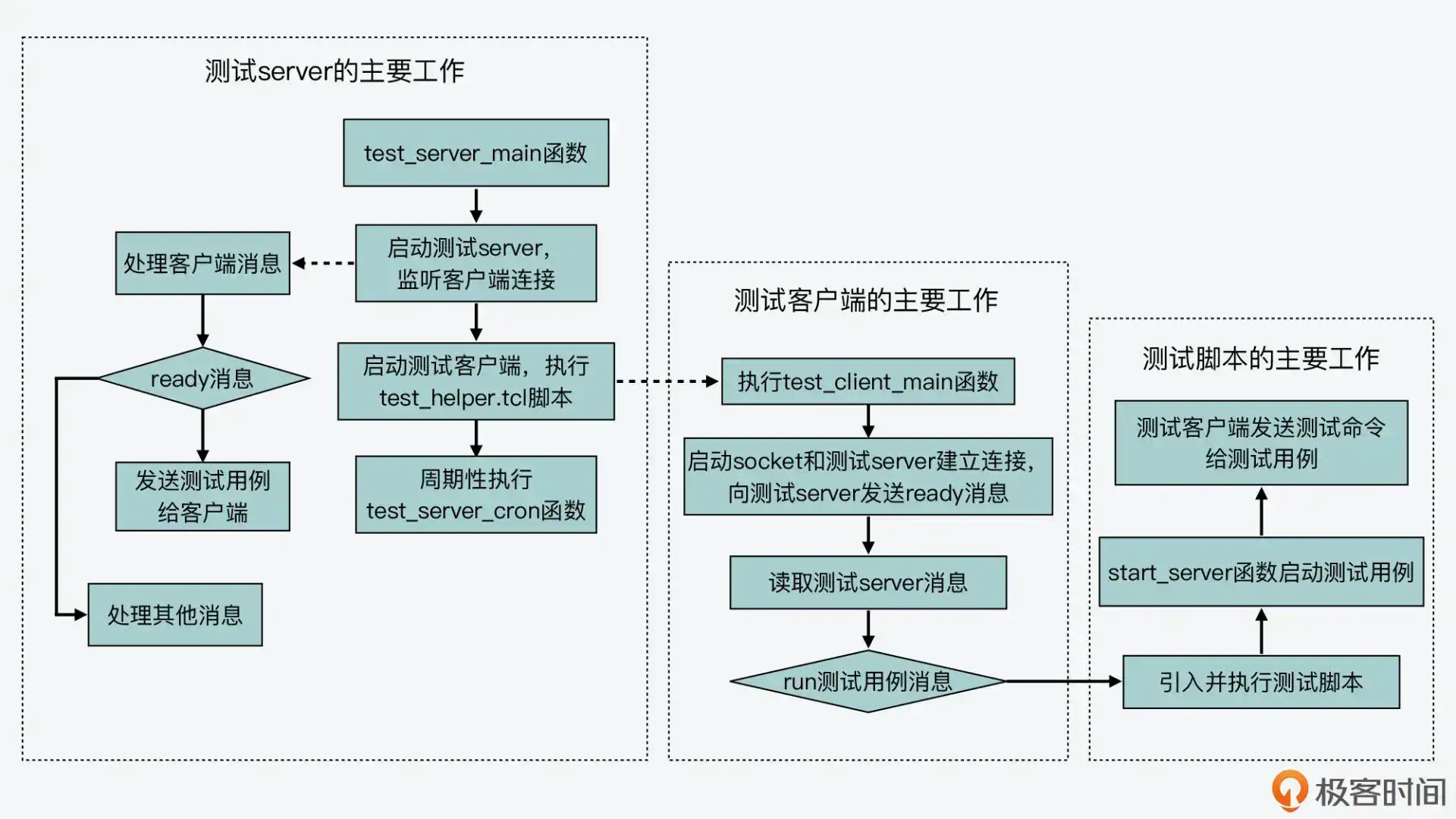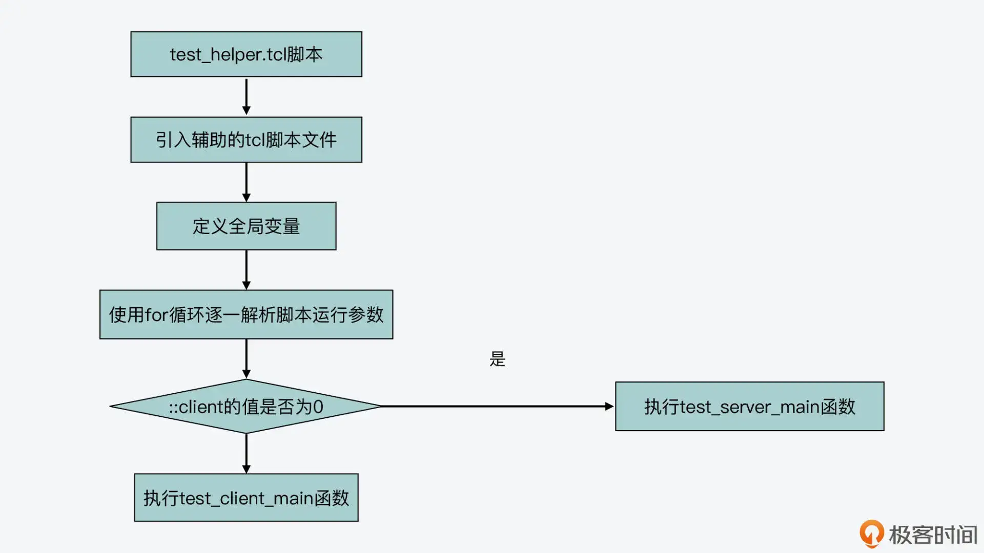 我在这里画了一张图,展示了 test_helper.tcl 脚本执行的基本流程,你可以再回顾下。